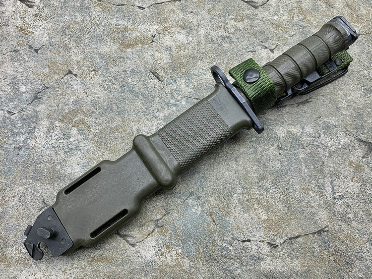 全长:312mm 刃长:181mm 刃厚:6mm 刃宽:36.5mm 刃材:425M 硬度:58HRC 产地:美国 重量:449g M9刺刀是一种多功能现代刺刀。它除了作为枪用刺刀和格斗匕首外,还可以当野战工具刀使用。M9刺刀就其系统结构来看,可划分为刀柄,刀柄座,刀柄芯杆,横挡护手,刀身,刀鞘,刀鞘镶件,磨刀石,挂带,腰带挂扣等。其中深绿色的刀柄是美国杜邦公司生产的ST801尼龙材料制成,呈原柱形,表面刻有网纹和环形槽,握持手感好,访滑,而且绝缘性能极佳。刀鞘也是用ST801尼龙材料制成,其强度也很高,正面附带条形纤维布袋,可装小件物品;背面贴有磨刀石,平时用纤维织带覆盖加以保护。刀鞘底部为钢制镶件,用内六角螺钉与刀鞘固定在一起,镶件上有驻笋和剪切刃口,螺丝刀刃口位于最顶端,该镶件即可作为改锥用,也可用作开瓶器。
