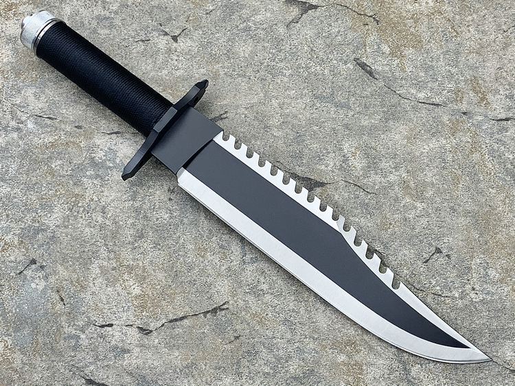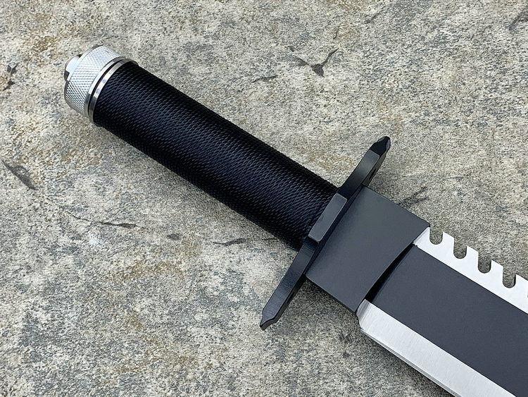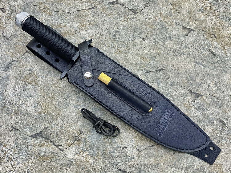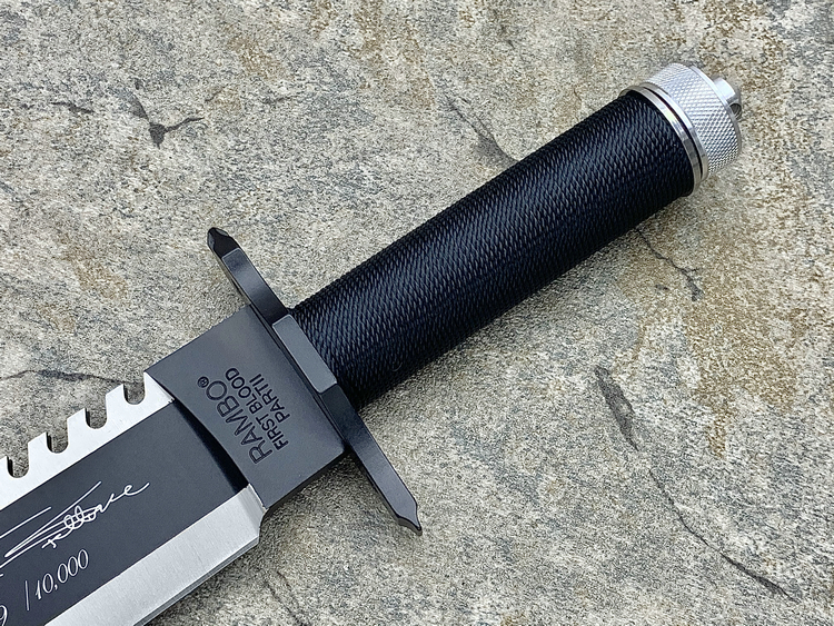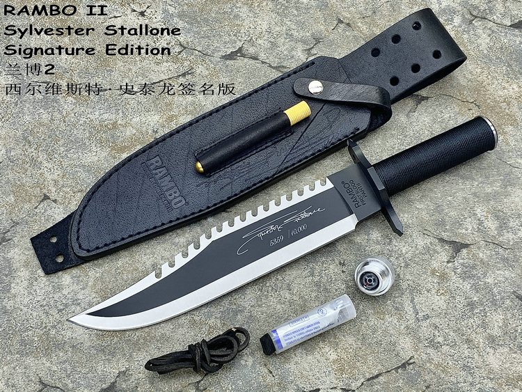 美国联合刀具出品史泰龙签名版,电影第一滴血中出镜,经典作品,每支独立编号限量10000支,黑色尼龙绑绳柄,内置防水O形圈和求生工具,皮鞘,金刚石磨刀棒。