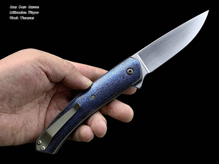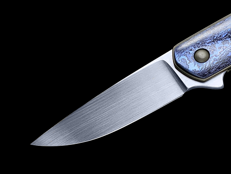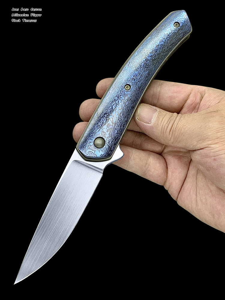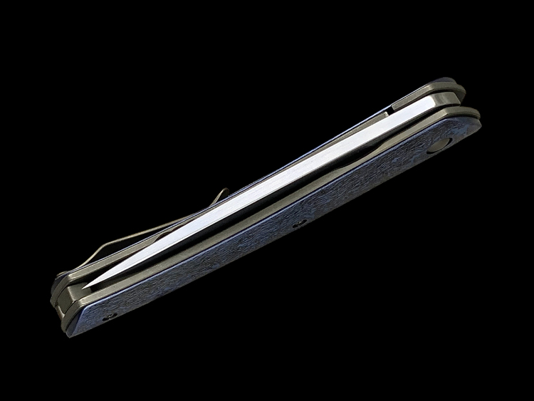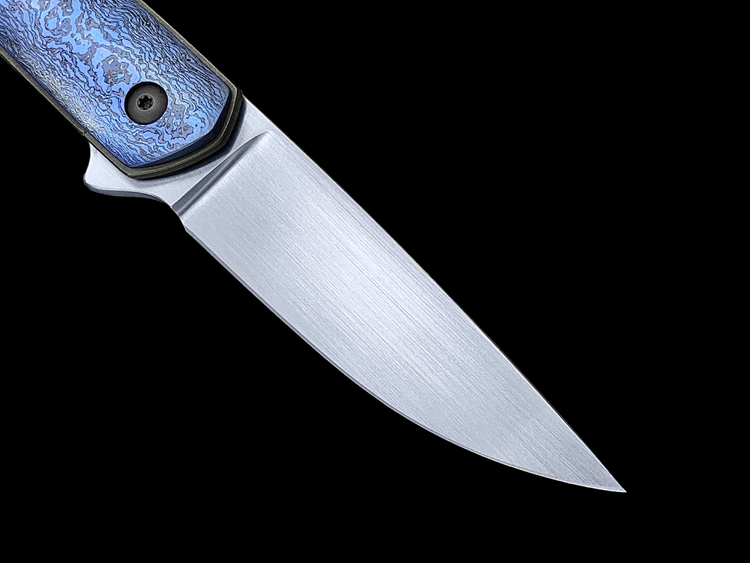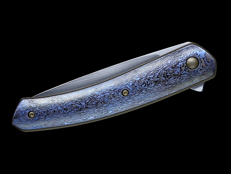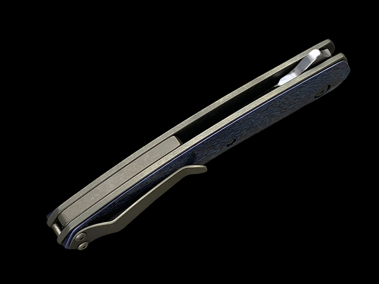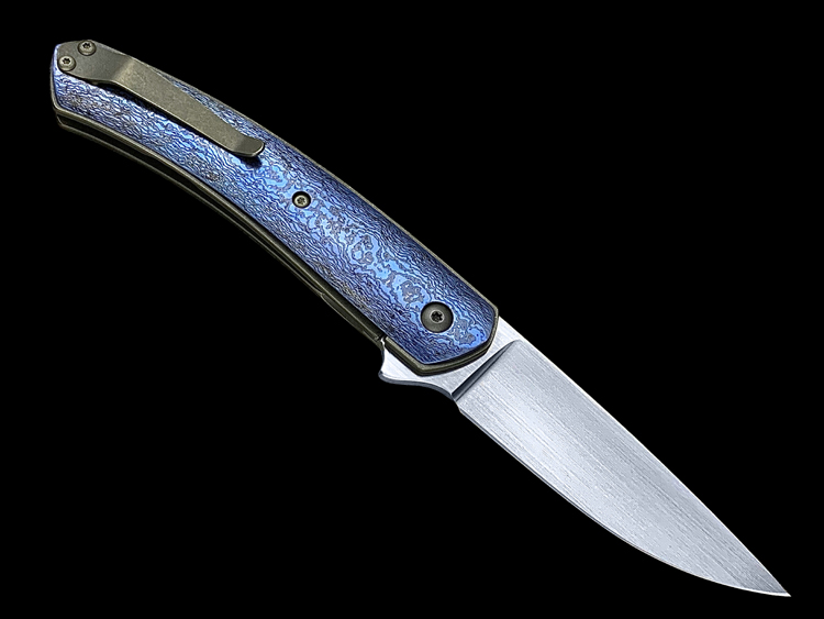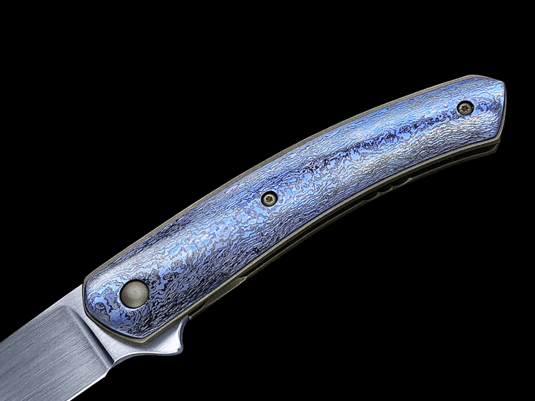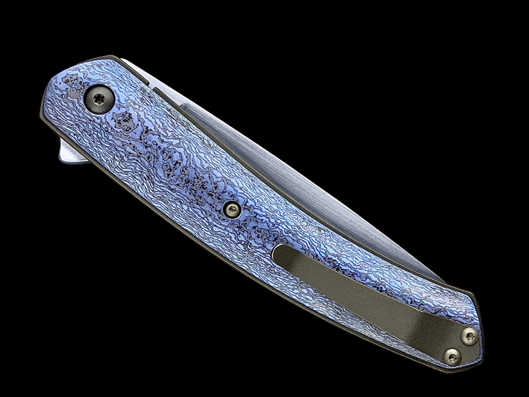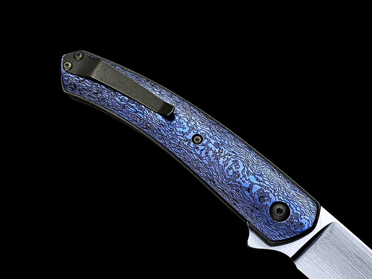 该款Millennium Flipper采用RWL34粉末钢手工拉丝简洁、利落体现了刀匠超高的手工制作能力,蓝黑色钛马士革素雅、美观,鱼鳍快开可玩性极强。不可多得的一支手工折刀。