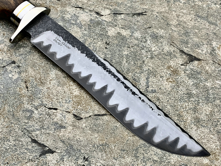 52100核心夹钢,镐地采用锻打原皮以凸显粗犷风。52100核心纹路就如青藏高原高低起伏的山峰雄伟、壮阔。