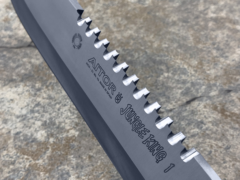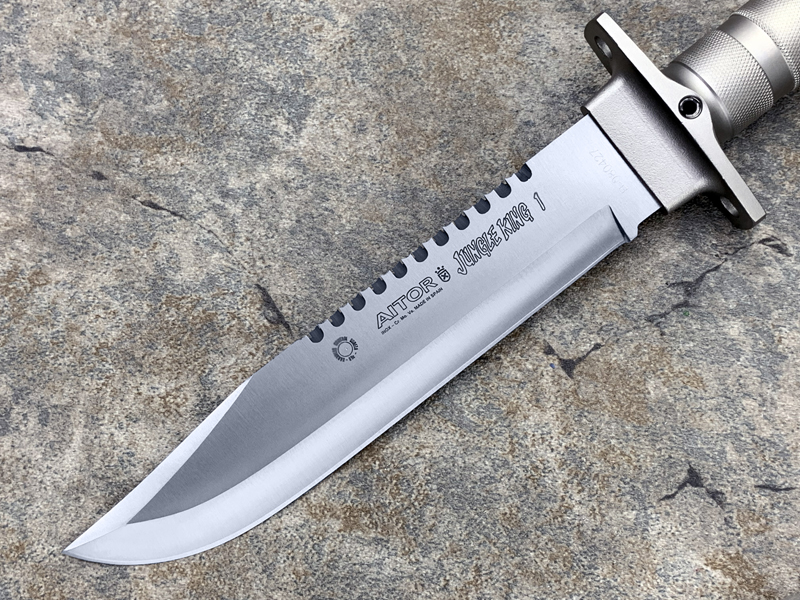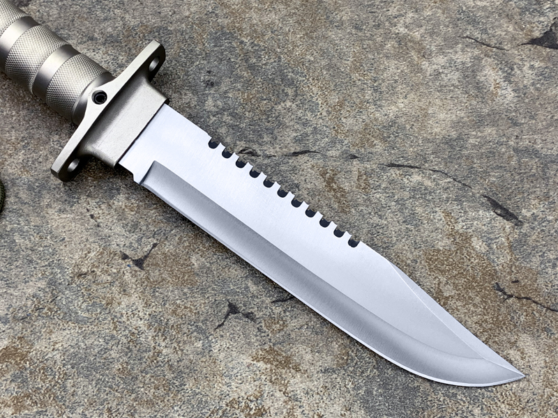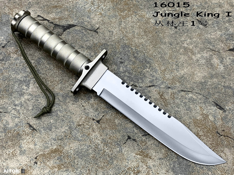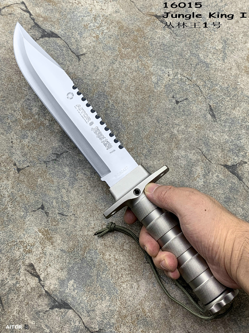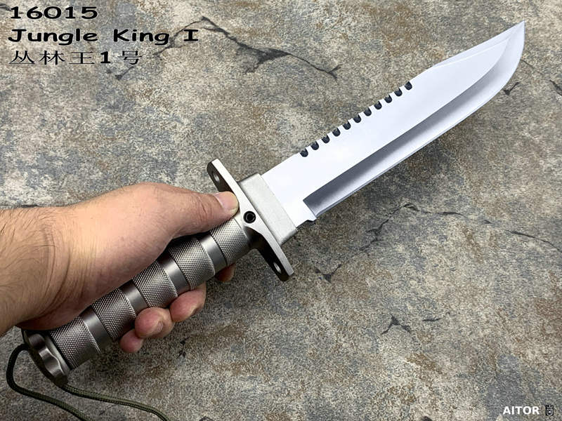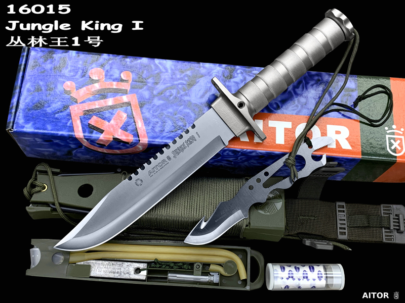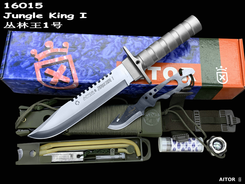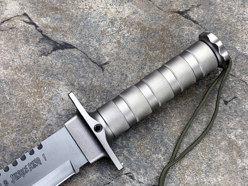 “丛林王”求生刀在奥托公司的产品中属求生系列产品(生存) ,是多功能,多用途求生组合刀,按尺寸大小和附件数量分一,二,三三种型号。 从整体外形来看, “丛林刀王”求生刀的刀型为当前较流行的狩猎刀型,刀背有可锯断木材的锋利背齿,而且主要偏重于劈砍。刀柄为铝合金制空心管,内藏求生装备,并具防水功能,为该系列刀具中最高档型号。刀刃以铆接方式固定在刀柄上,其上刻有品牌,型号,出产编号等。