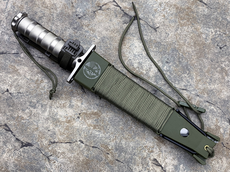 1 。附刀:主要用于剥皮,割断细而坚韧的绳子如降落伞绳等。附刀上的圆孔可穿绳子绑在树枝上,使附刀变成长矛。附刀尾端可用当开罐器或开瓶器,还有可当一字螺丝起子的尖端。