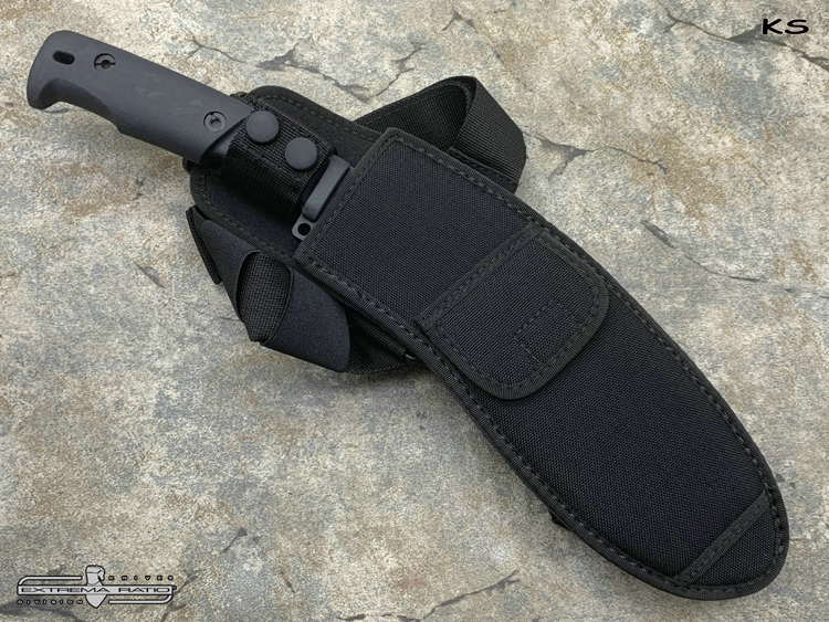 KS 的尺寸是重量级的露营刀,它的轻巧设计使得它独一无二,本款刀由N690 不锈钢所制成,附半坚硬的尼龙战术刀鞘,其握把材质来自一种称做Forprene 的聚合物,是Extrema Ratio 与Perugia 动力科学研究室合作的特殊材质。