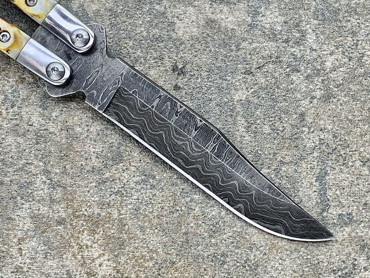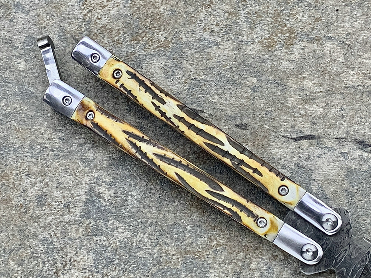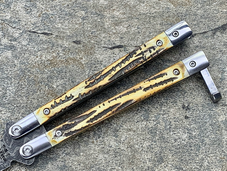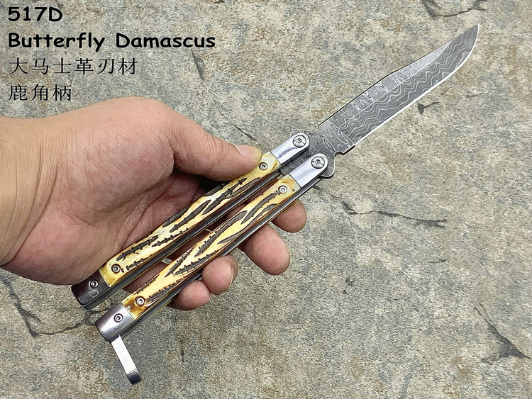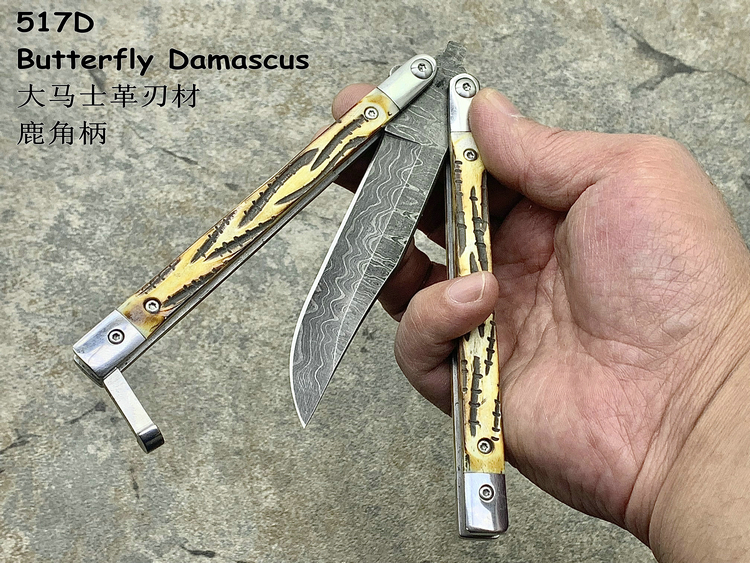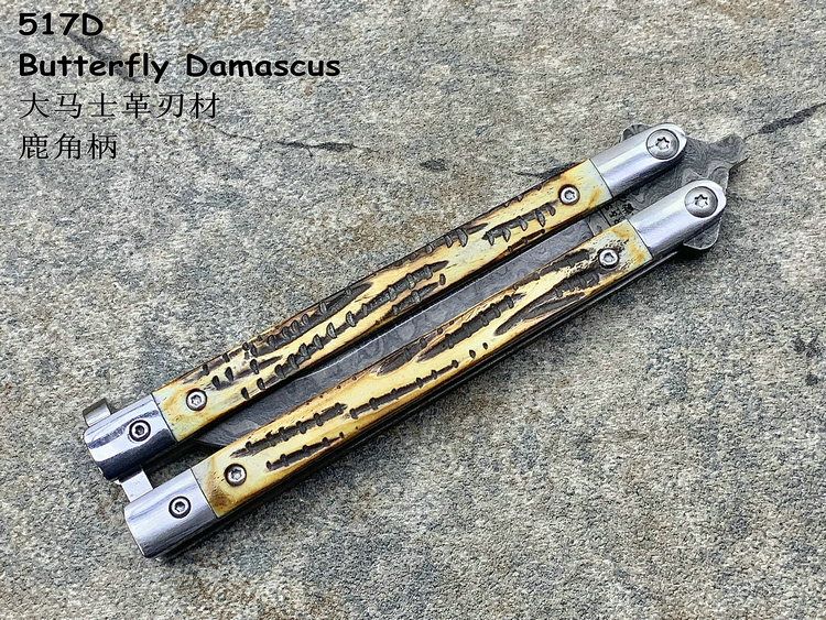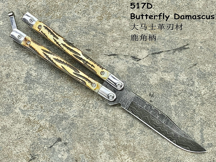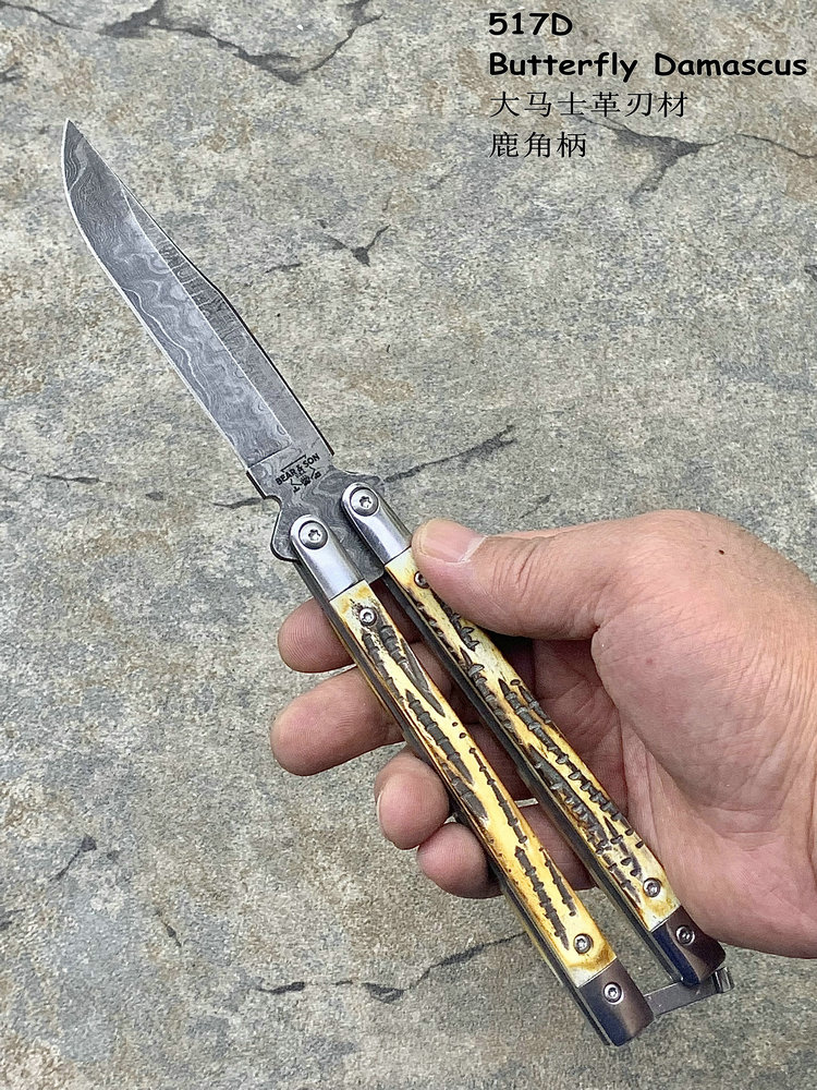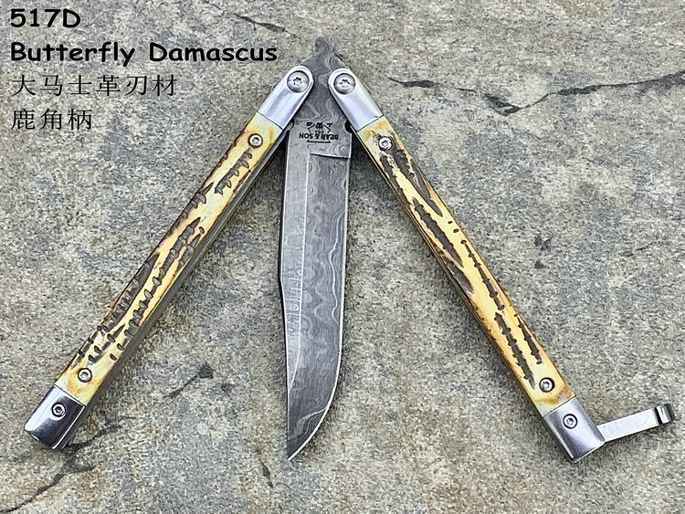 Bear&Son 熊之子 517D Butterfly Damascus 大马士革刃材 雄鹿角柄甩刀