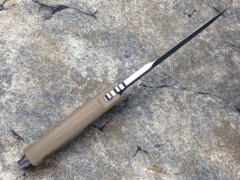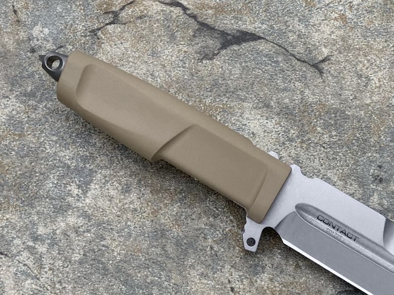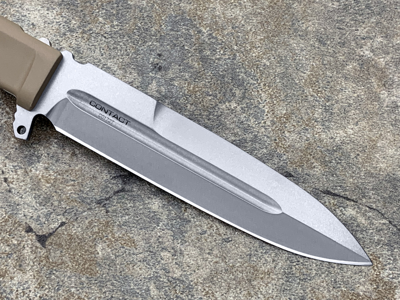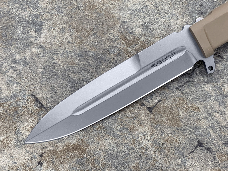 Extrema Ratio 联络者。 矛状刀型、大平磨和菱形几何形状。 它有一个下部护手以保护手免受意外割伤,上部拇指槽以提高操控性,沿刀片开大凹槽。 所有这些特征使 Contact 型号获得了现在著名的悲悯者的哥哥的称号,在比例和某些技术特征上进行了改进。 新系列多用途刀具中的第一款。 刀片由 Böhler N690 钢制成,硬度为 58 HRC,黑色版本采用化学抛光涂层。 该系列中的所有其他颜色都有石洗饰面刀片。 手柄仍然是橡胶材质,但组装不再通过侧面螺丝而是通过截锥形不锈钢尾钉固定,该尾钉拧在底部并安装在一个特殊的刀座内,这使得它坚固且平衡良好。 护套是极简主义的,通过采用二级保留系统去除了大部分织物,让人想起了其灵感来源的款式。 主鞘由耐冲击尼龙注塑而成。 辅助固定系统是可逆的,可实现刀的灵巧便携性。 由于锥形形状非常适合刀的快速插入和拔出,刀片在护套的插入中被引导。 要拔出刀片,扳机上的压力就足够了,从而脱离将刀片安全地固定在护套中的保险装置。 一个系统被插入到ABS外壳的水平槽中,为刀片提供缓冲,以避免在将刀片放入内部时发出震动噪音。 尼龙护套的背面设计用于与 M.O.L.L.E. 系统连接。 织物部分减少到最低限度,具有经典的双按钮安全带,带安全带环和带橡胶加固的大腿带,以防旋转。Extreme Ratio旨在将刀具的厚度和尺寸降至最低,但不会节省结构强度和安全附件。