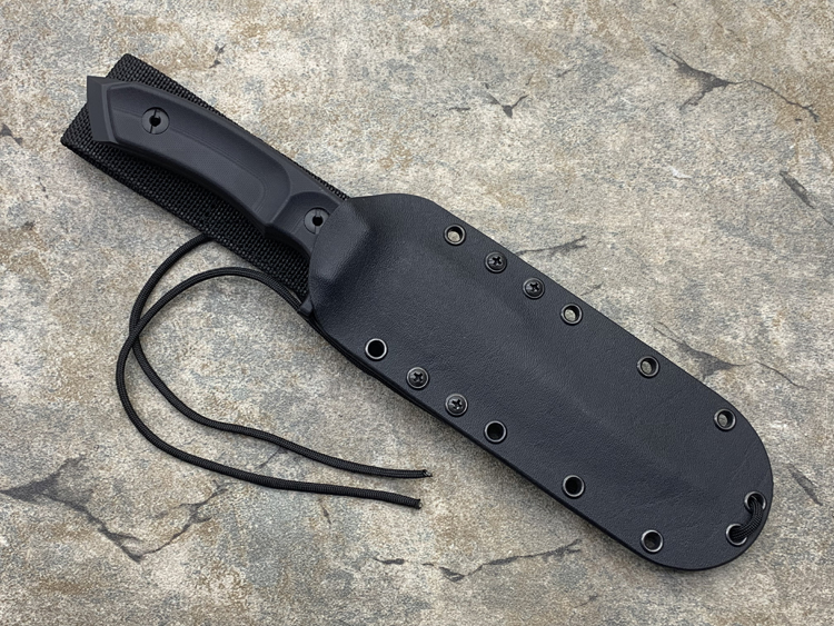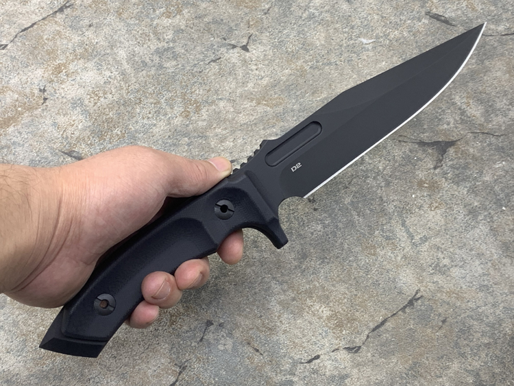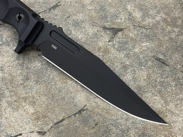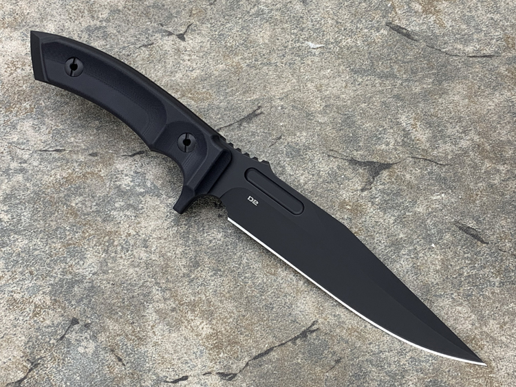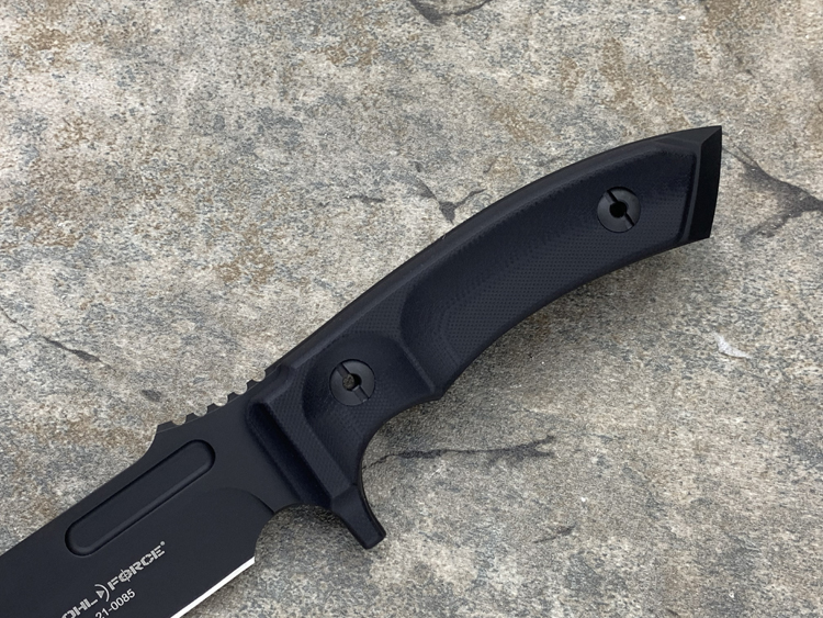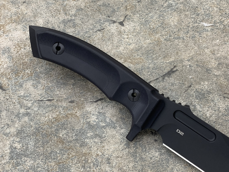 坚固的 17.4 厘米长和 6 毫米厚的 Bowie 刀片适用于广泛的应用。对于高切削耐用性和刀片耐用性,选择了著名的D2工具钢。黑色 TiN 涂层可靠地防止了不必要的光反射。坚固的全龙骨结构配以黑色 G-10。精致的 3D 铣削表面为 Tactical 8 提供了出色且安全的握持感。护手前明显且圆润的手指凹槽可以让手指向前以进行强力或精细的工作。手柄末端的隐藏孔提供了安装挂绳的选项。