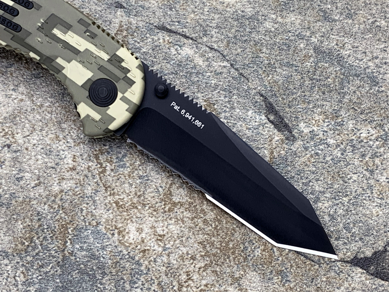 SOG 美国哨格 AE-07 "Aegis"数码迷彩黑色全刃助力快开折刀的刀刃采 AUS-8 不锈钢制造,表面有黑色 TiNi 涂层。握把使用GRN 玻璃强化尼龙制作, 其上镶嵌三条压印 SOG 字样的防滑橡皮条、质感良好且轻巧好握,数码迷彩配色,更符合现代军事作战的规格需求。不仅有合手的尺寸,更让你使用时觉得特别顺手!它拥有 SOG 专利的 S.A.T. ( SOG Assisted Technology)半弹结构,只要轻轻推动拇指柱至一定程度,刀刃就会迅速弹出!闭合时,单手拇指往回轻拉刀刃解锁钮,另一手将刀刃压回,刀刃即可闭合。安全锁 "Arc-Actuator" 可在闭合时进一步上锁, 安全性更为提高!
