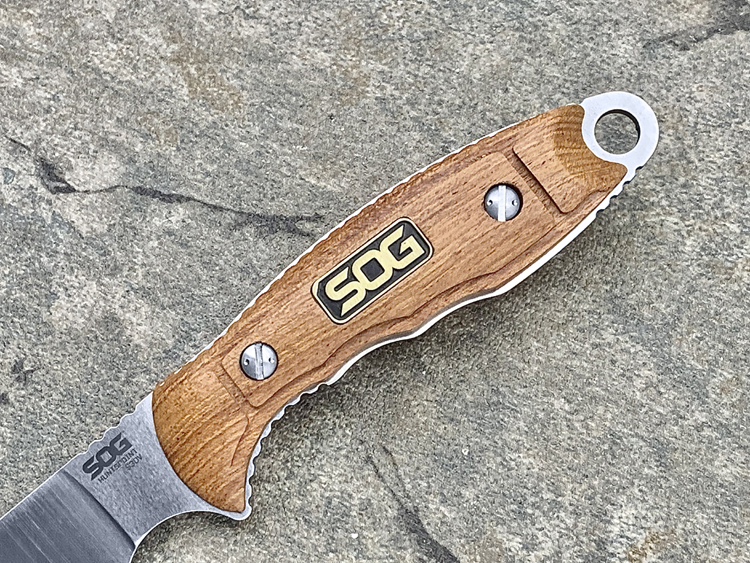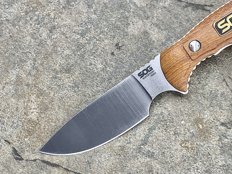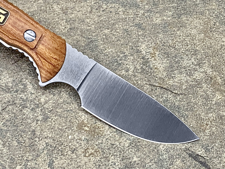 该款猎刀采用CPM S30V刃材,经典红木手柄,手柄下侧有手指防滑槽在精细工作时可以更精准的操控。美国产皮套