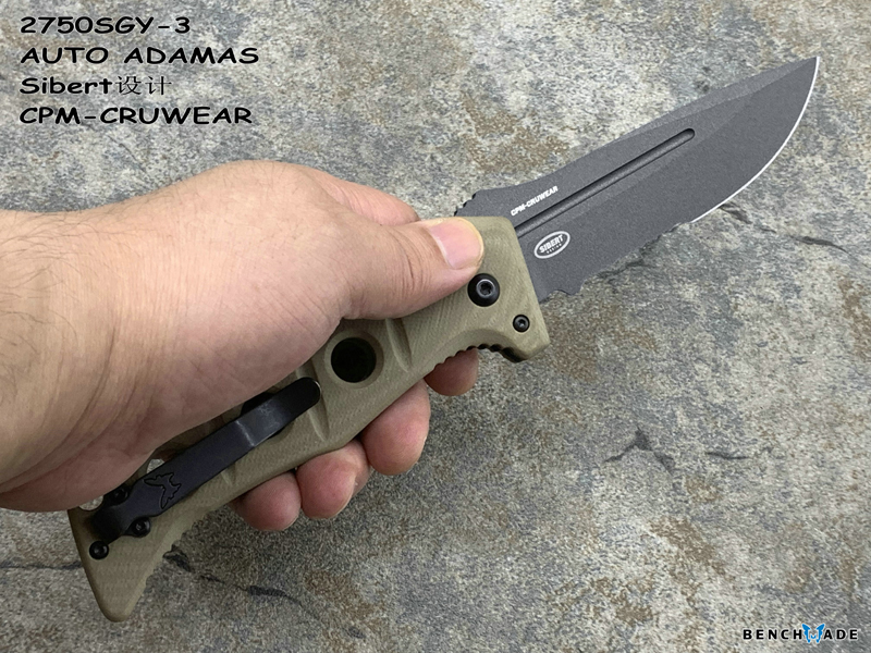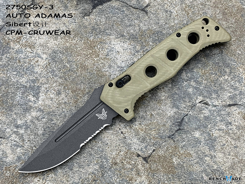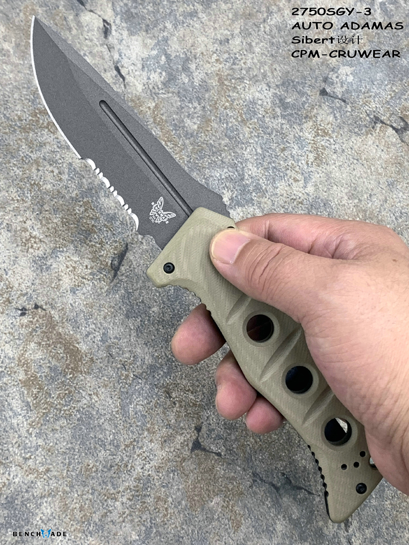 简单描述: Benchmade 蝴蝶 2750SGY-3 AUTO ADAMAS Sibert设计CPM-CRUWEAR超级强壮工具钢刃材 G10柄硬汉战术助力快开半齿折刀