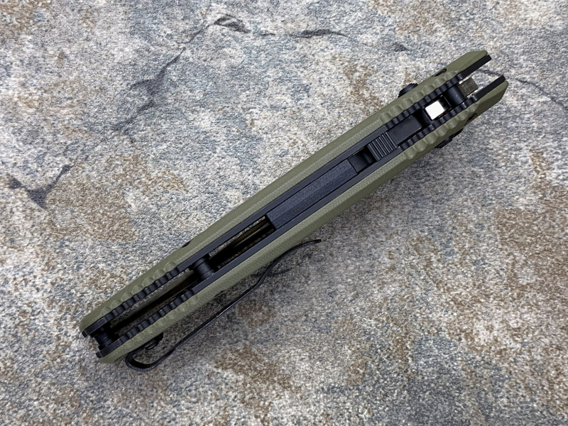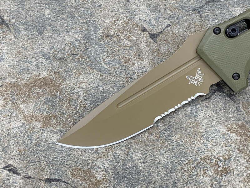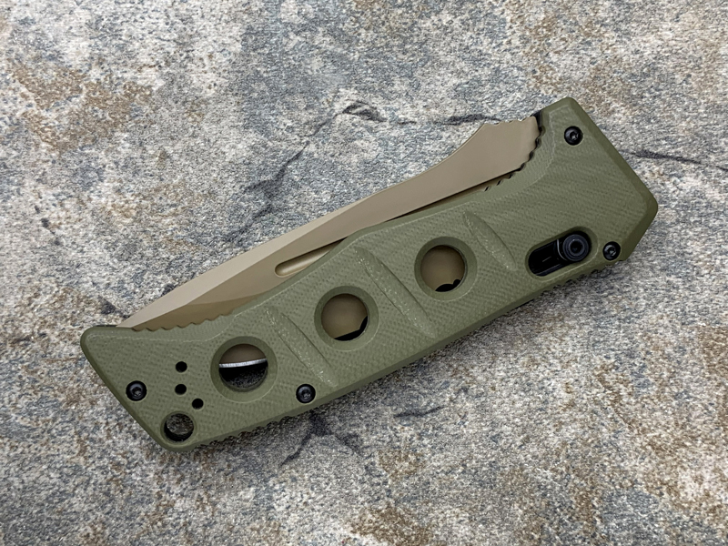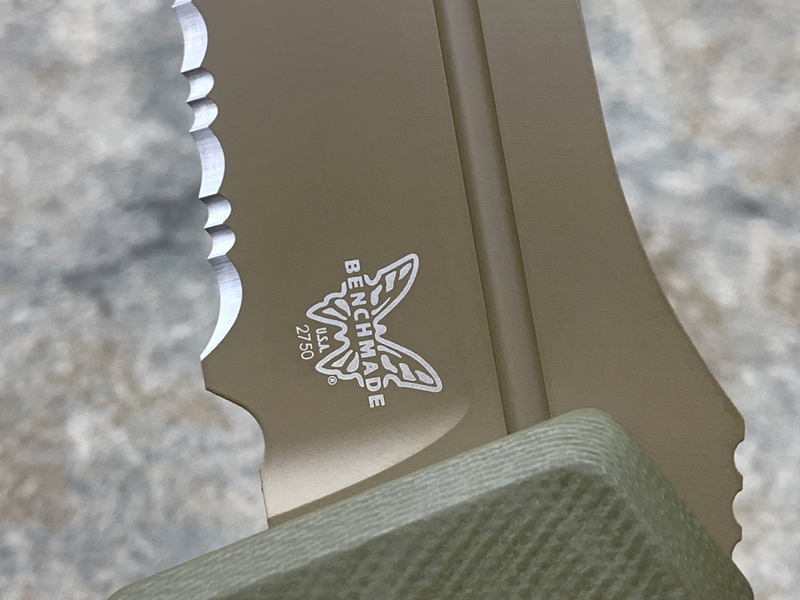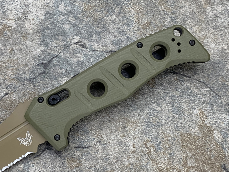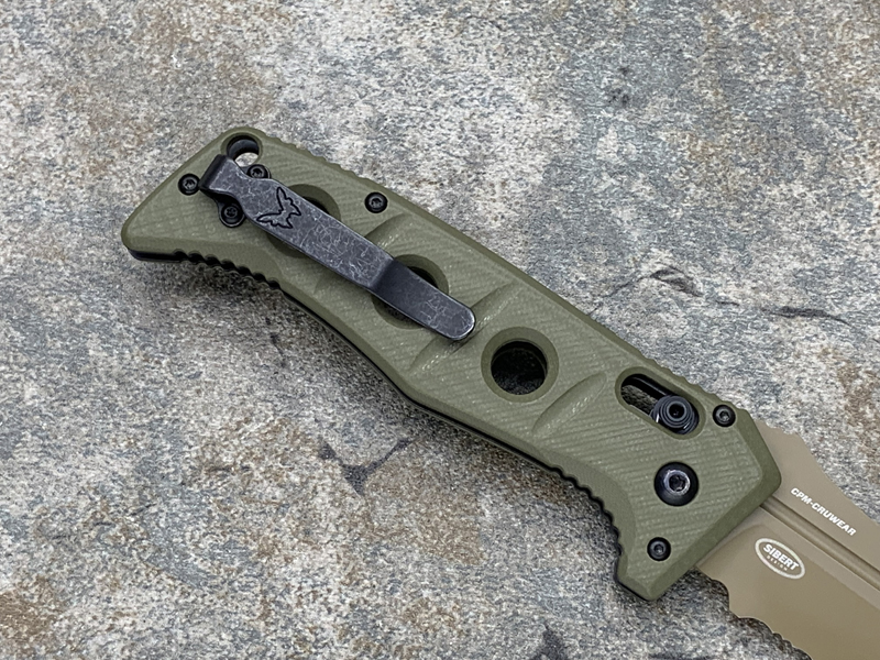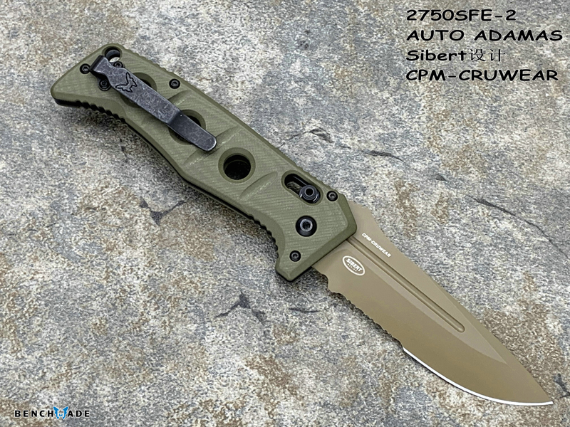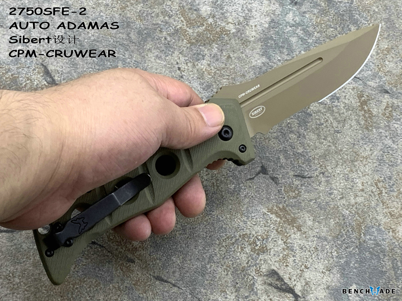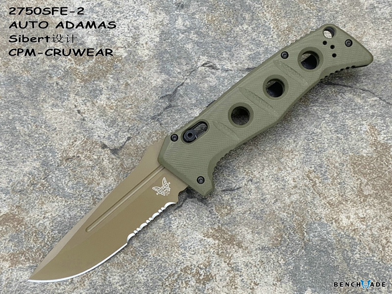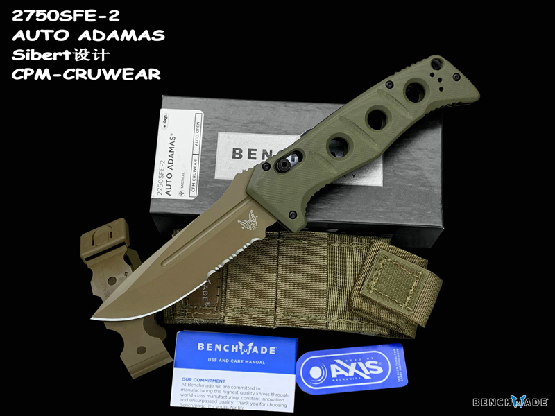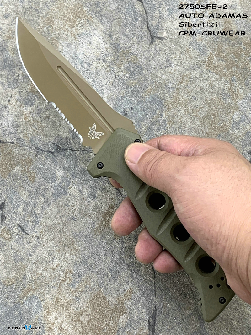 蝴蝶的2750 Adamas系列作品是由定制刀匠Shane Sibert与美国军方代表Major Jeff Strueker所共同合作的战术作品。Major Strueker在1987-2011年期间服役于美国陆军,其大多数时间隶属于第75游骑兵团(The 75th Ranger Regiment),此外他还是蝴蝶刀具的忠实粉丝。Adamas系列作品尺寸和分量感十足,适合把握且破坏力十足,完全符合战术需求。 这把2750 是由CPM-CRUWEAR超级强壮工具钢锻造的水滴头折刀,在野外环境下能提供出色的切削能力和易打磨能力。CPM-CRUWEAR超级强壮工具钢的全刃刀身切削性能出色,钢材的强度和较大尺寸让刀具更加适合劈砍,为了更好的保障刃部的完整性,刀身的减压血槽可以有效的将刀部受力进行分散。刀身表面使用灰色涂层处理,更加防锈也更符合战术使用。 刀柄拥有黑色涂层的不锈钢内衬,有效的保障的柄部强度,外部使用G-10材质贴附以提供出色的手感。刀柄部分使用镂空切割技术刻有减重/排汗孔,既能有效减轻刀具重量也能在长时间握持后也不易出现手部出汗的情况。刀柄尺寸非常适合手握,在戴手套情况下也能舒适握持。刀具使用轴锁的双头轻推即可迅速出刀,并使用蝴蝶著名的轴锁机制收刀,刀背有保险。刀具还配备一个可换边安装的黑色刀夹和拥有携行装置的重型尼龙刀套。