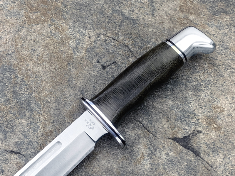 刀柄材质为米卡塔,拥有出色的手感和外观表现。刀柄上采用铝材制作护手和尾部圆头,采用抛光技术更加闪亮并保障使用安全。