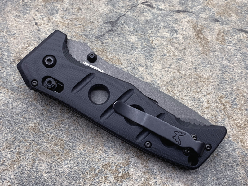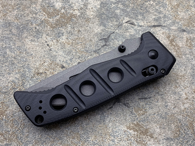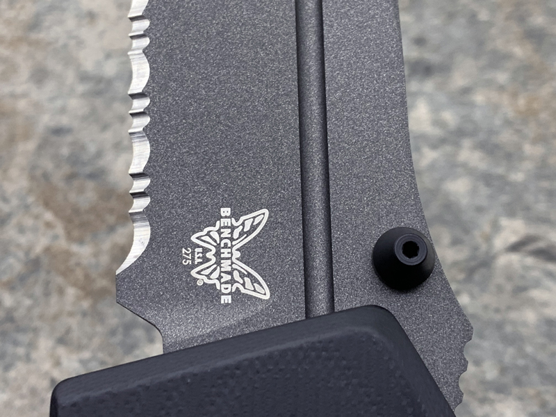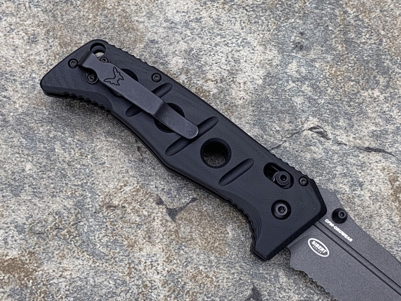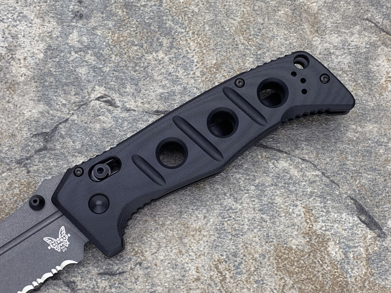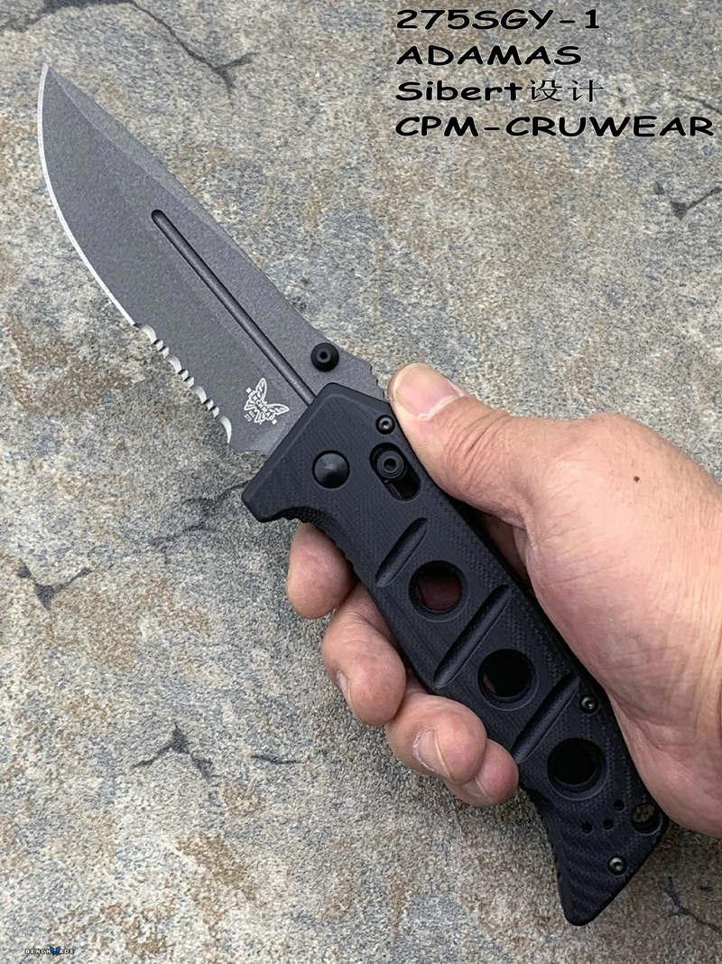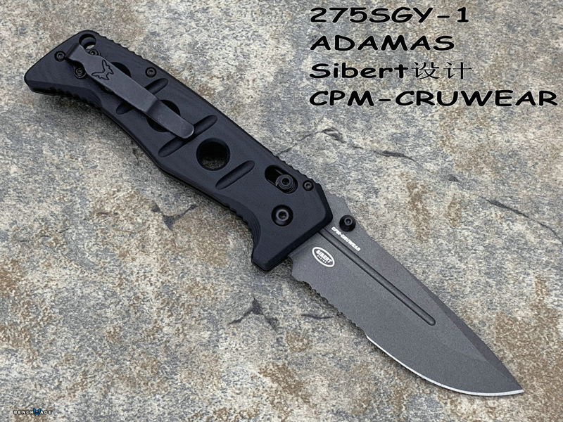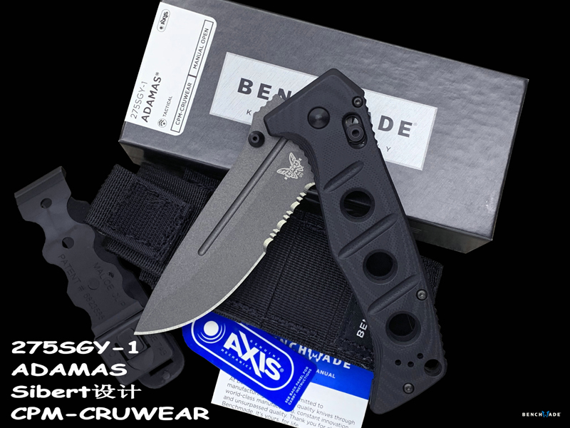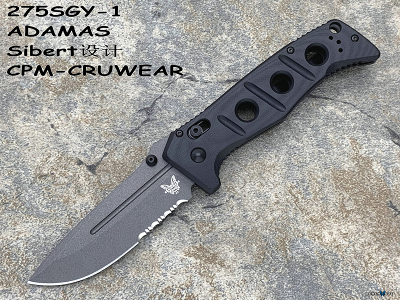 蝴蝶的275 Adamas系列作品是由定制刀匠Shane Sibert与美国军方代表Major Jeff Strueker所共同合作的战术作品。Major Strueker在1987-2011年期间服役于美国陆军,其大多数时间隶属于第75游骑兵团(The 75th Ranger Regiment),此外他还是蝴蝶刀具的忠实粉丝。Adamas系列作品尺寸和分量感十足,适合把握且破坏力十足,完全符合战术需求。 这把275 是由CPM-CRUWEAR超级强壮工具钢锻造的水滴头折刀,在野外环境下能提供出色的切削能力和易打磨能力。CPM-CRUWEAR超级强壮工具钢的全刃刀身切削性能出色,钢材的强度和较大尺寸让刀具更加适合劈砍,为了更好的保障刃部的完整性,刀身的减压血槽可以有效的将刀部受力进行分散。刀身表面使用涂层处理,更加防锈也更符合战术使用。 刀柄拥有黑色涂层的不锈钢内衬,有效的保障的柄部强度,外部使用G-10材质贴附以提供出色的手感。刀柄部分使用镂空切割技术刻有减重/排汗孔,既能有效减轻刀具重量也能在长时间握持后也不易出现手部出汗的情况。刀柄尺寸非常适合手握,在戴手套情况下也能舒适握持。刀具使用轴锁的双头轻推即可迅速出刀,并使用蝴蝶著名的轴锁机制收刀。刀具还配备一个可换边安装的黑色刀夹和拥有携行装置的重型尼龙刀套。