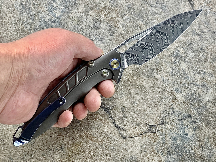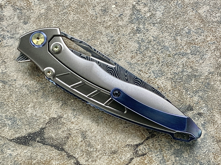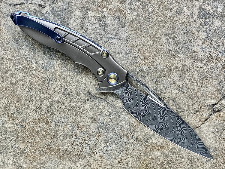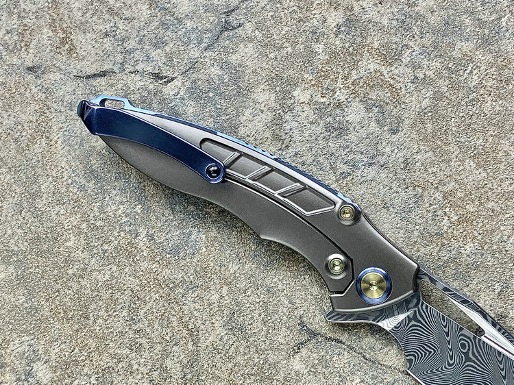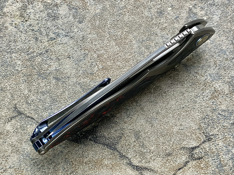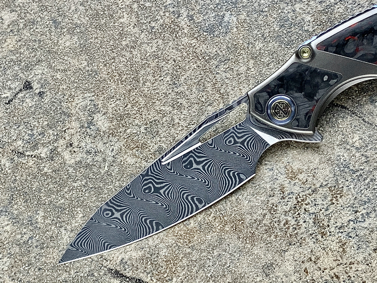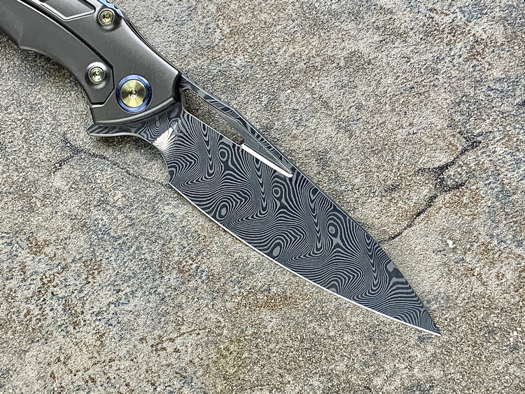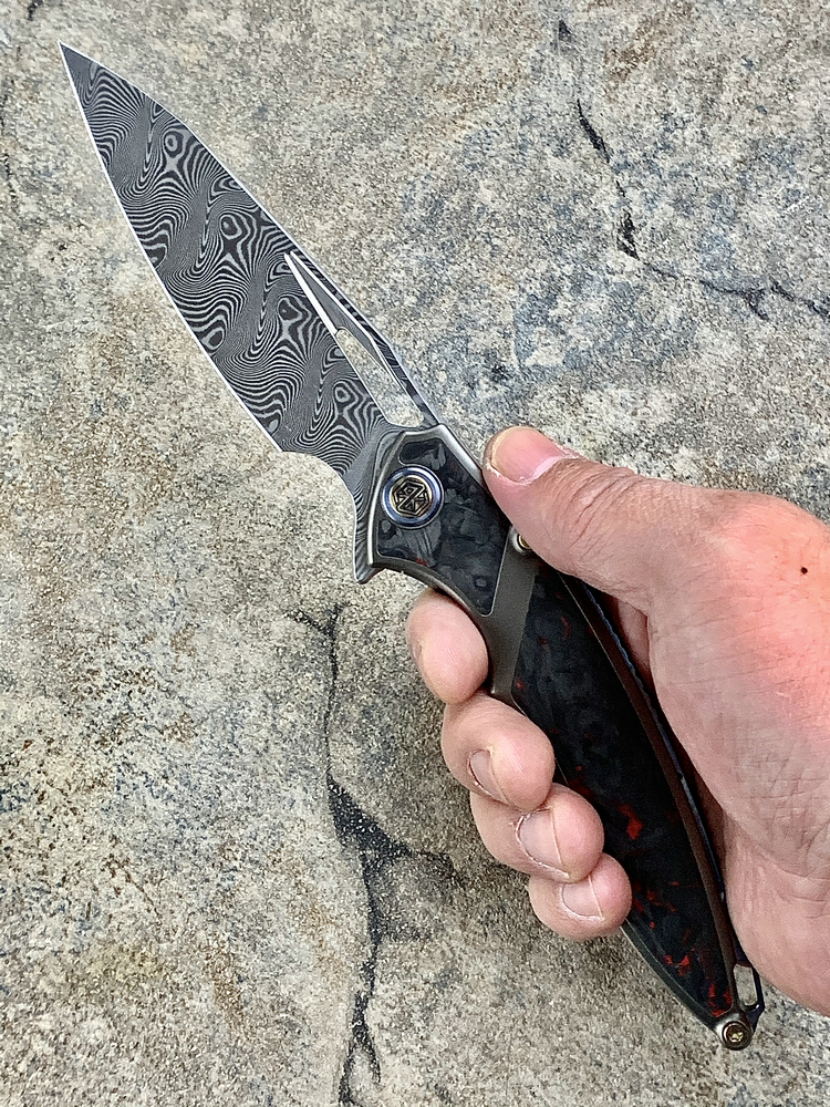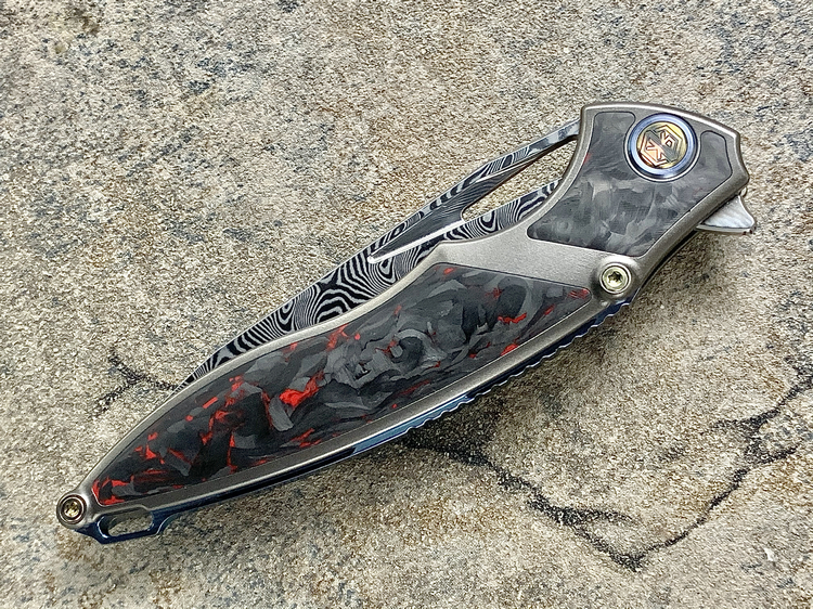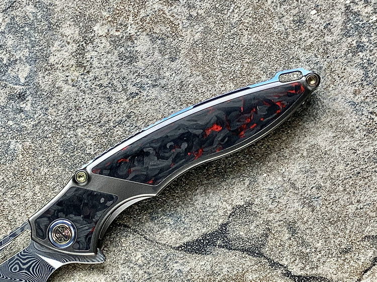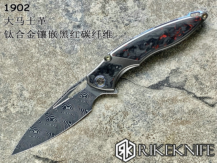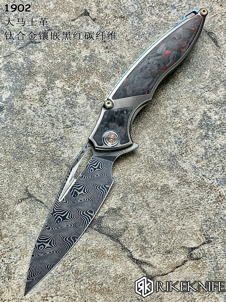 Rike Knife 1902 大马士革刃材 钛合金镶嵌黑红双色碳纤维 鱼鳍快开折刀