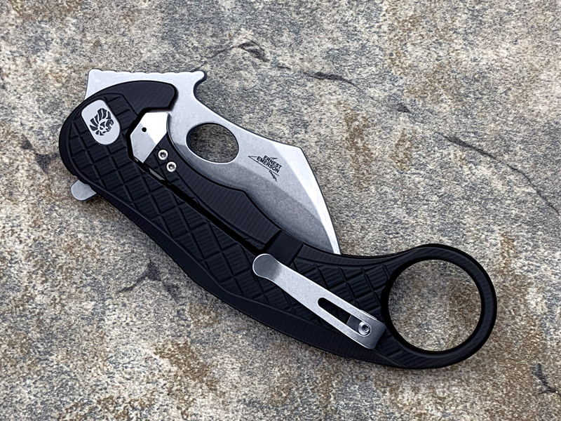 lionSTEEL-Emerson ONE 是与 Emerson Design 合作开发的新型 SOLID Karambit 。一体框架锁手柄已经是 lionSTEEL 的一个独特特征,它是由一块实心 Ergal 铝铣削而成,而D片则由 CPM MagnaCut 钢制成,硬度达到64HRC。