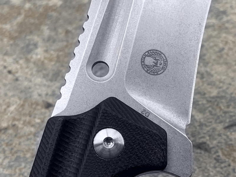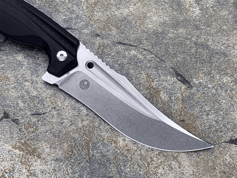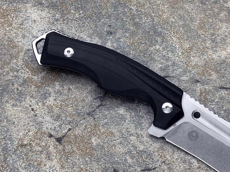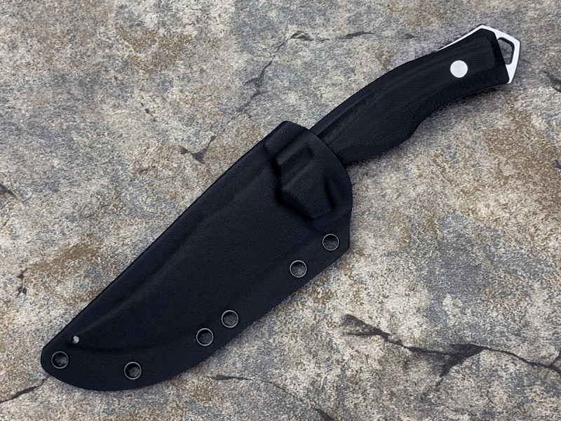 黑色G10柄,D2钢石洗刀片,一体龙骨,尾部有破窗器、系绳孔。波斯风格刀型。黑色K鞘礼盒装。
