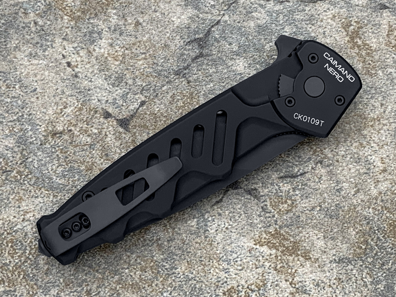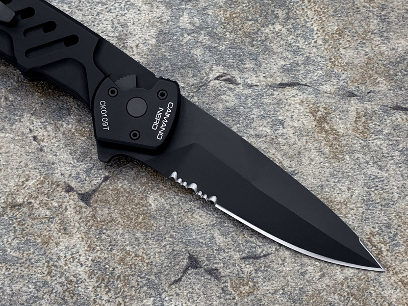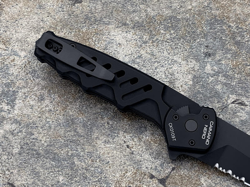 黑色凯门鳄是 Comsubin (意大利海军水下特种行动队)的官方供应商 Extrema Ratio 开发并交付给意大利海军的 G.O.I.(Operation Group Incursori) 的战术刀。它的名字是为了纪念英雄 Caimani Neri del Piave、Regia Marina 的 Arditi 部门和其他自愿成员,他们在第一次世界大战期间游过 Piave 入侵敌方领土。它是一种带有 4 毫米“矛形”刀片的自动跳刀,具有不对称形状开假刃以增加其穿透性。刀片上的齿让您可以切割电缆和高强度织物,同时保持锋利。这是一个结构强壮的中型折叠刀。高厚度的铝制手柄,手柄镂空,使刀具轻巧且平衡。手柄的末端部分让人想起慢速运行的鱼雷(S.L.C.)的螺旋桨/方向舵组的形状,用于提高操控性,以便从口袋中快速出刀。 DLC 涂层钛夹有三种安装方式。它的形状旨在最大限度地减少口袋外手柄的尺寸。即使在打开过程中发生意外撞击,自动刀片释放系统也能确保完全打开。除了硬质金属玻璃破碎器外,还有一个安全装置,当刀在打开状态穿刺时,防止解锁。