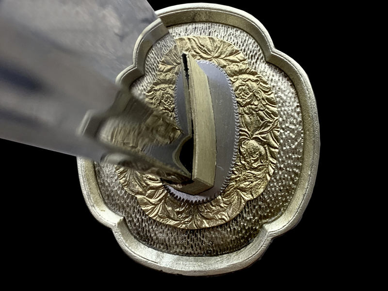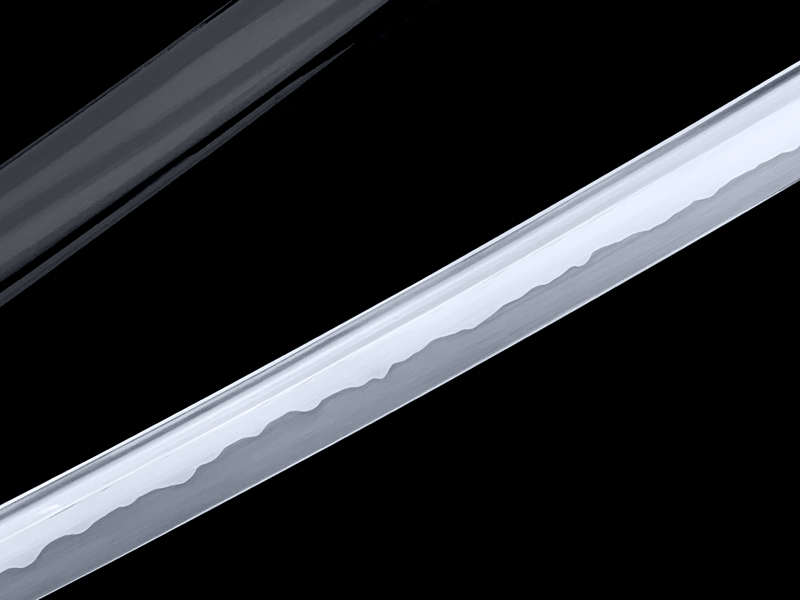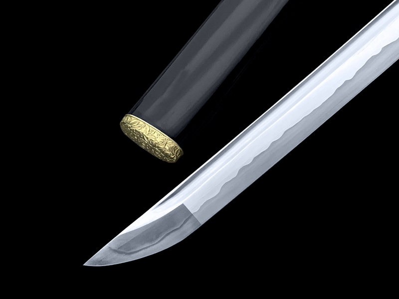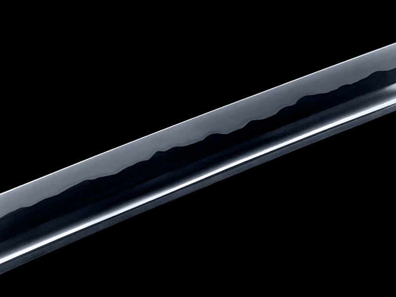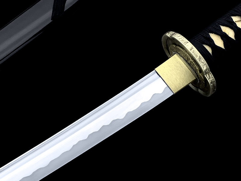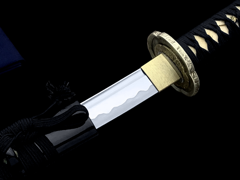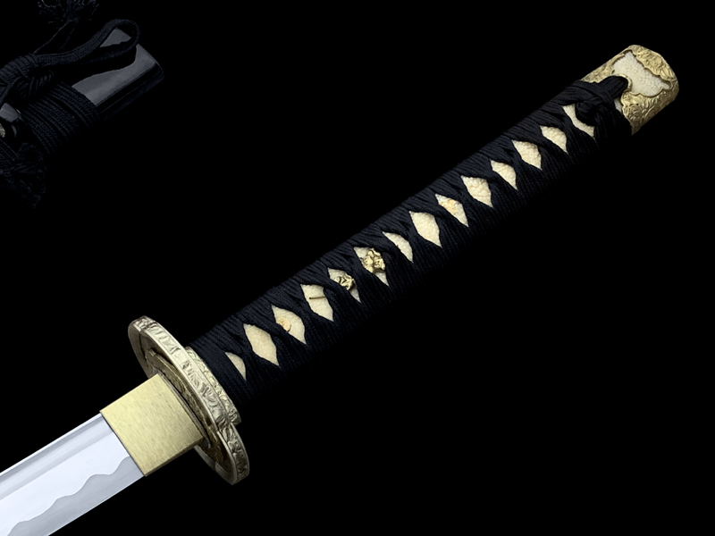 黑色柄卷,并包括传统的 Menuki 和 Samé(Ray Skin)。 随附的黑漆剑鞘由硬木制成,并以传统的日式风格完成镍银配件。