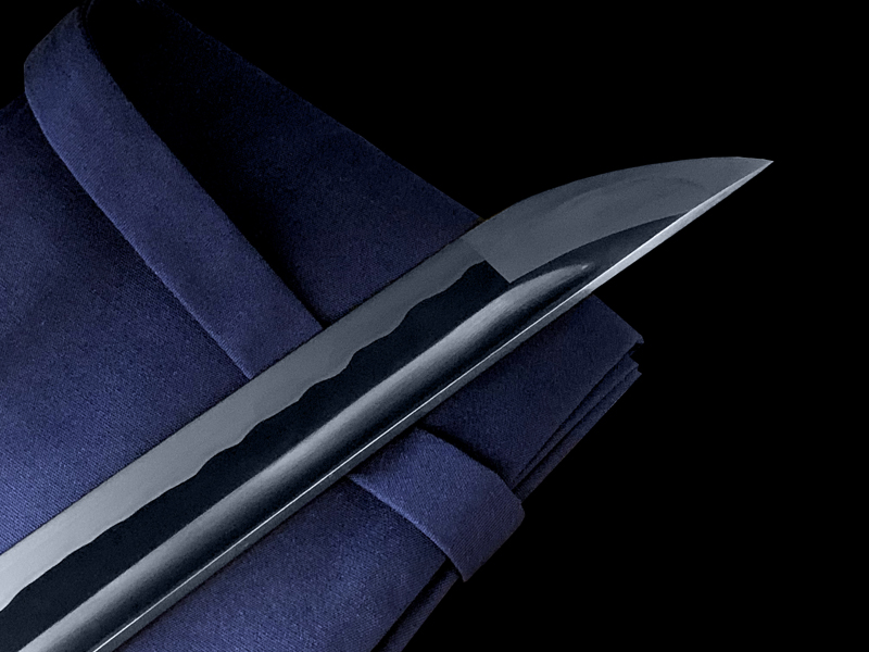镍银吞口和缘头。 凸磨折叠锻打1060 碳钢刀片。分段热处理,以独特的日本方式覆土烧刃呈现出优雅的波浪烧刃纹。