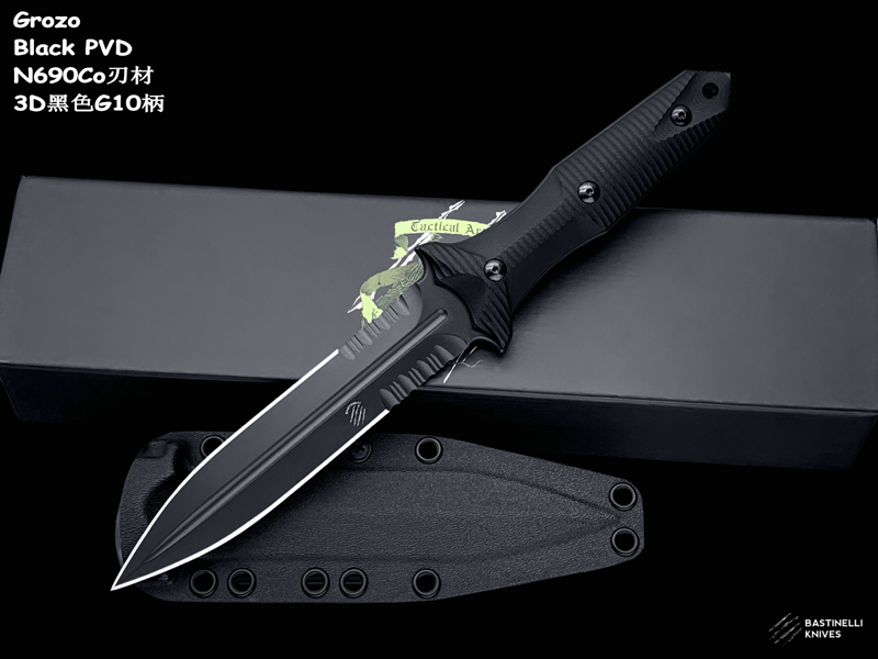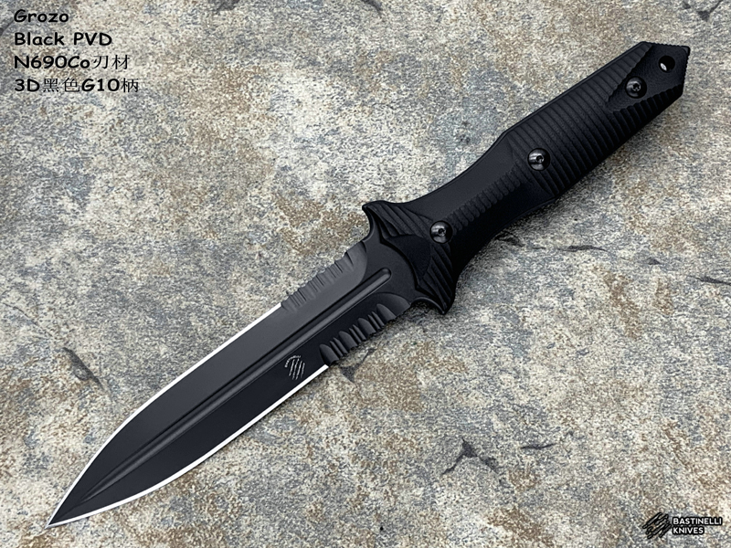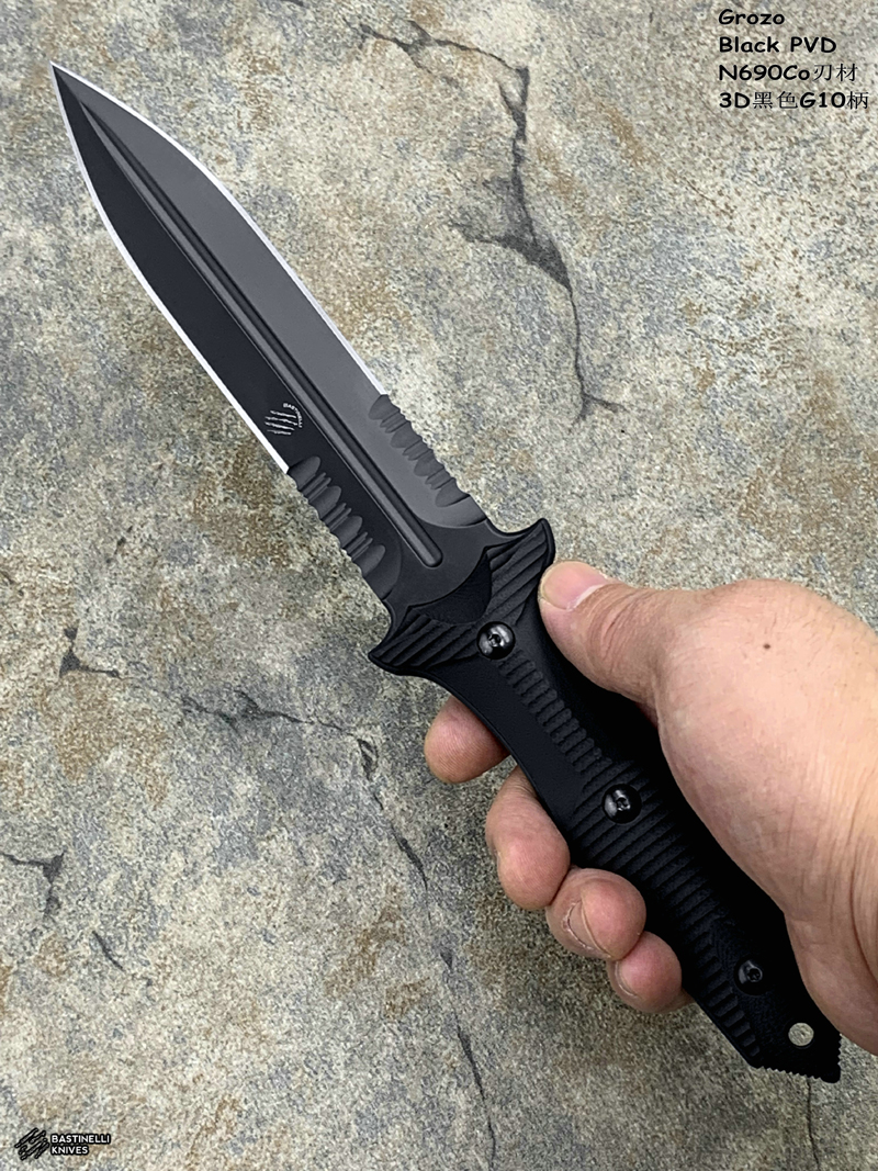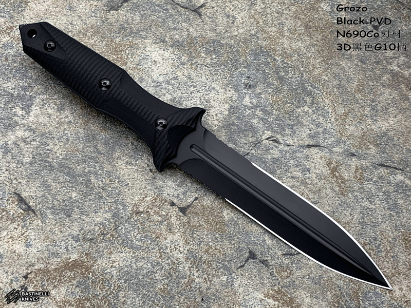 Bastinelli 巴斯蒂内利 Grozo Black PVD N690Co刃材 3D黑色G10柄 双锋半齿战术直刀(暂无现货)