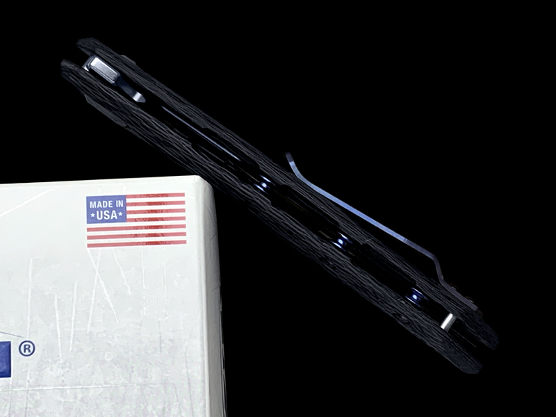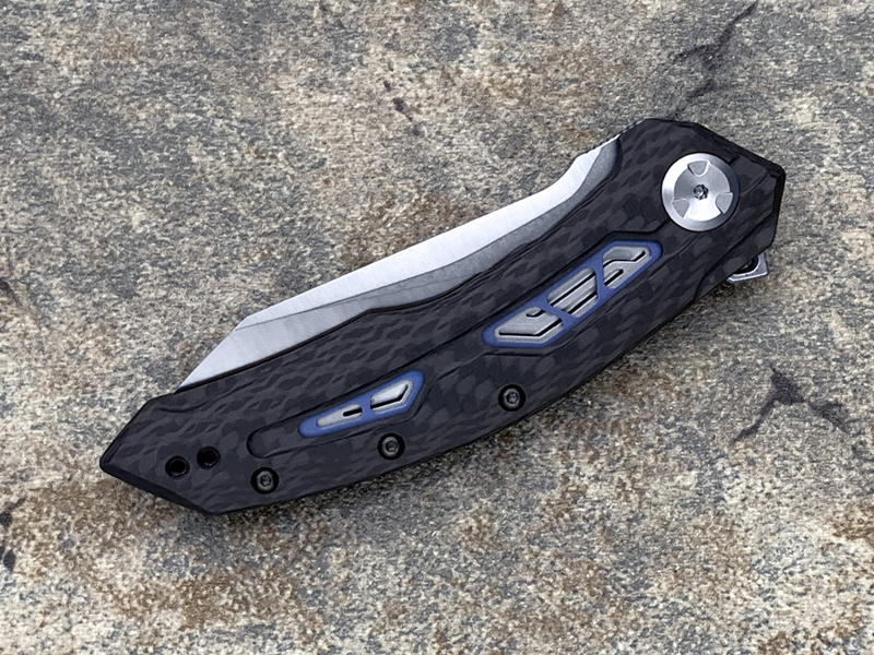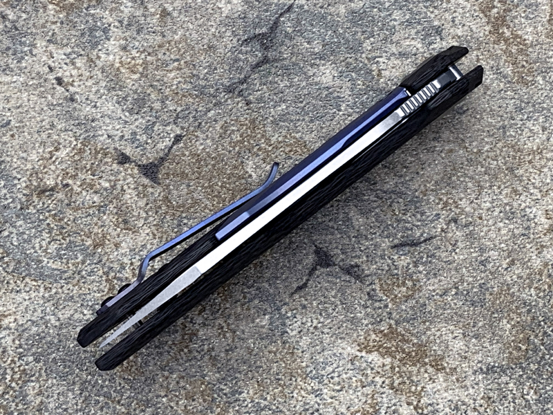匹配的蓝色阳极氧化硬件,框架锁,蓝色钛口袋夹与黑色碳纤维相得益彰。