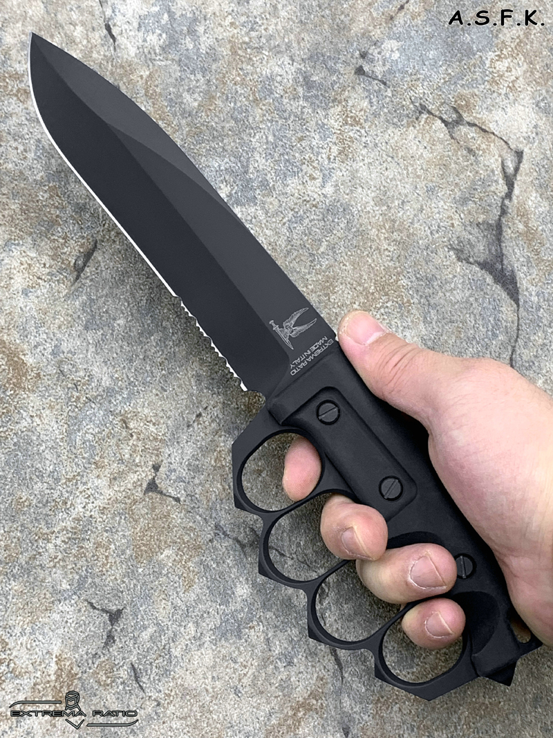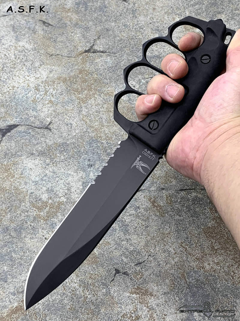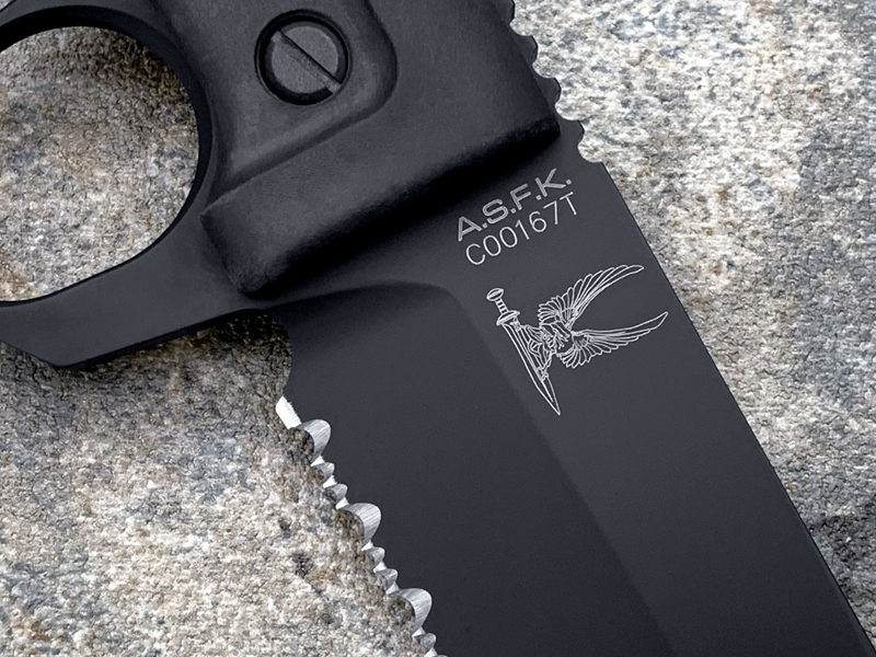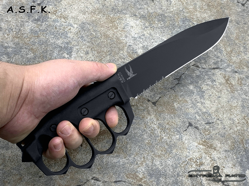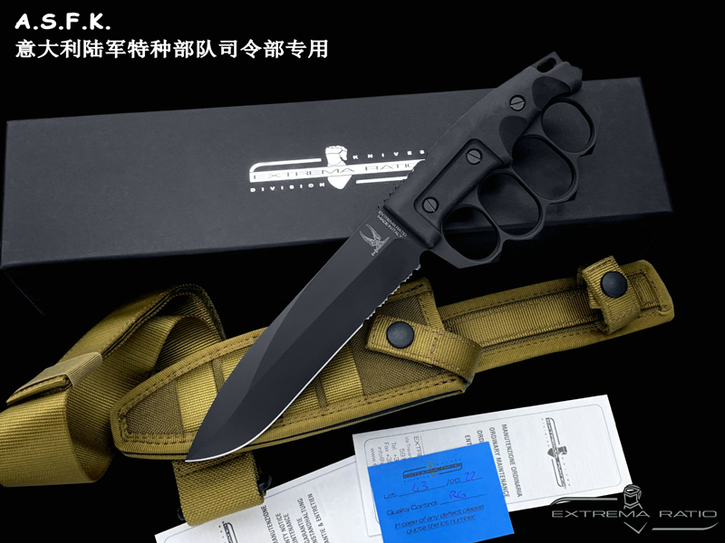 全长:289mm 刃长:162mm 刃材:N690 硬度:58HRC 刃厚:6.3mm 刃宽:37.5mm 产地:意大利重量:409g A.S.F.K. 是献给新陆军特种部队司令部 (COM.FO.SE) 采用并专用的刀。 A.S.F.K. 是一把以现代方式重新定义的战壕刀。 B?hler N690 钢刀片,带护环的氯丁橡胶手柄可在玻璃破碎时保护手。 A.S.F.K. 它配有带 M.O.L.L.E. 紧固系统的沙漠卡杜拉护套。
