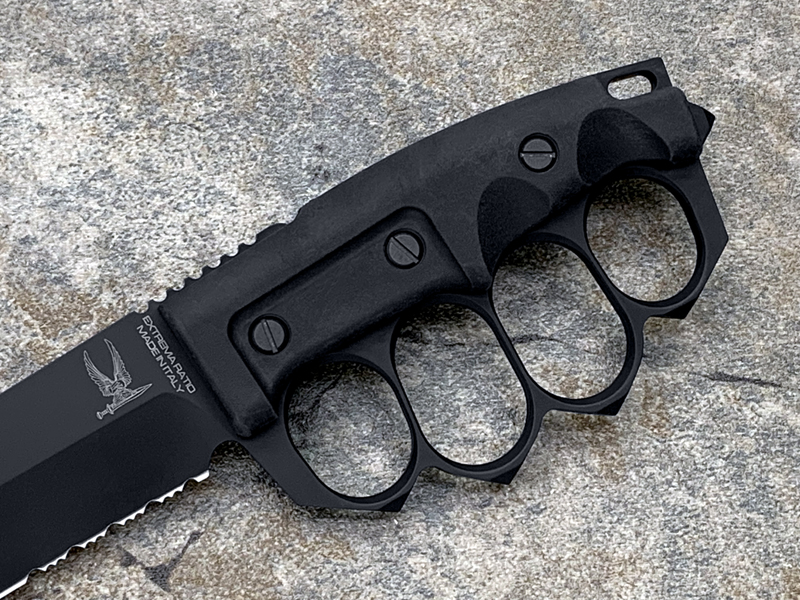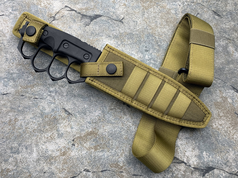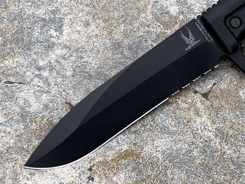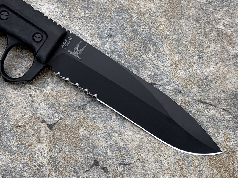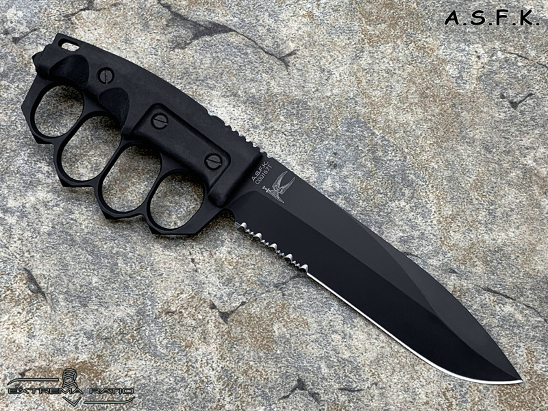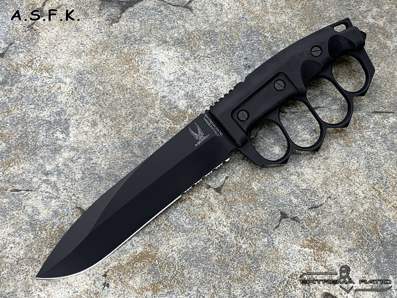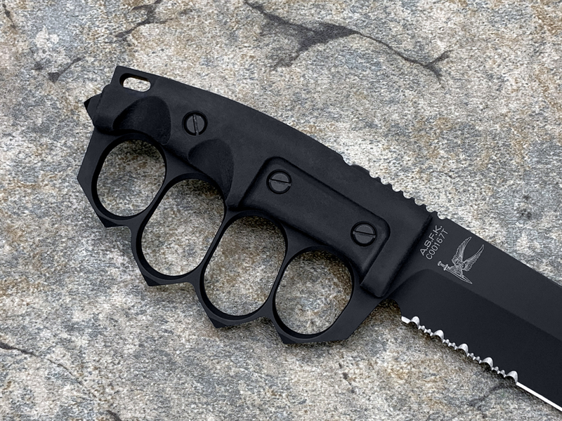 全长:289mm 刃长:162mm 刃材:N690 硬度:58HRC 刃厚:6.3mm 刃宽:37.5mm 产地:意大利重量:409g A.S.F.K. 是献给新陆军特种部队司令部 (COM.FO.SE) 采用并专用的刀。 A.S.F.K. 是一把以现代方式重新定义的战壕刀。 B?hler N690 钢刀片,带护环的氯丁橡胶手柄可在玻璃破碎时保护手。 A.S.F.K. 它配有带 M.O.L.L.E. 紧固系统的沙漠卡杜拉护套。