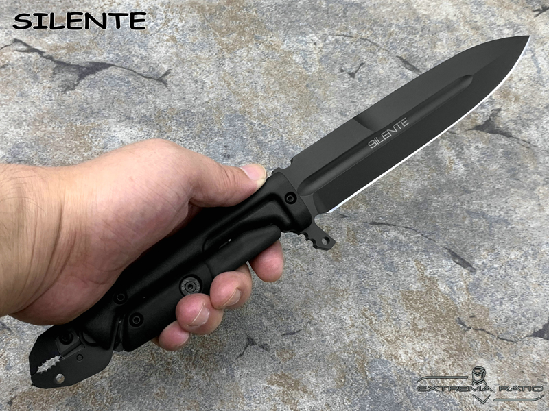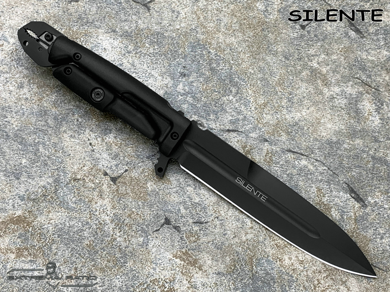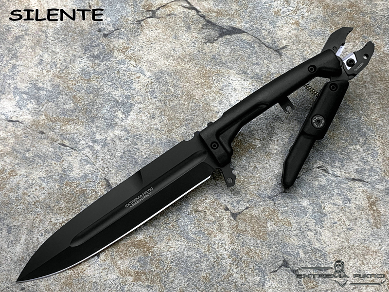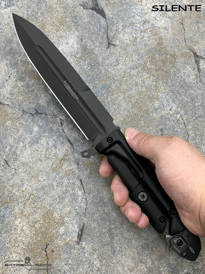 全长:308mm 刃长:154mm 刃材:N690 硬度:58HRC 刃厚:6.3mm 刃宽:33mm 产地:意大利重量:337g 意大利中央安全局40周年期间特委托极端武力设计一款战术救援刀作为国家反恐需求,SILENTE就此诞生。 意大利极端武力-国家警察反恐部门配发装备,手柄五合一多功能钳用于切割铁丝网,线材,钢缆等,并且由于其末端装有碳化钨嵌件,还可以用作玻璃破碎锤。